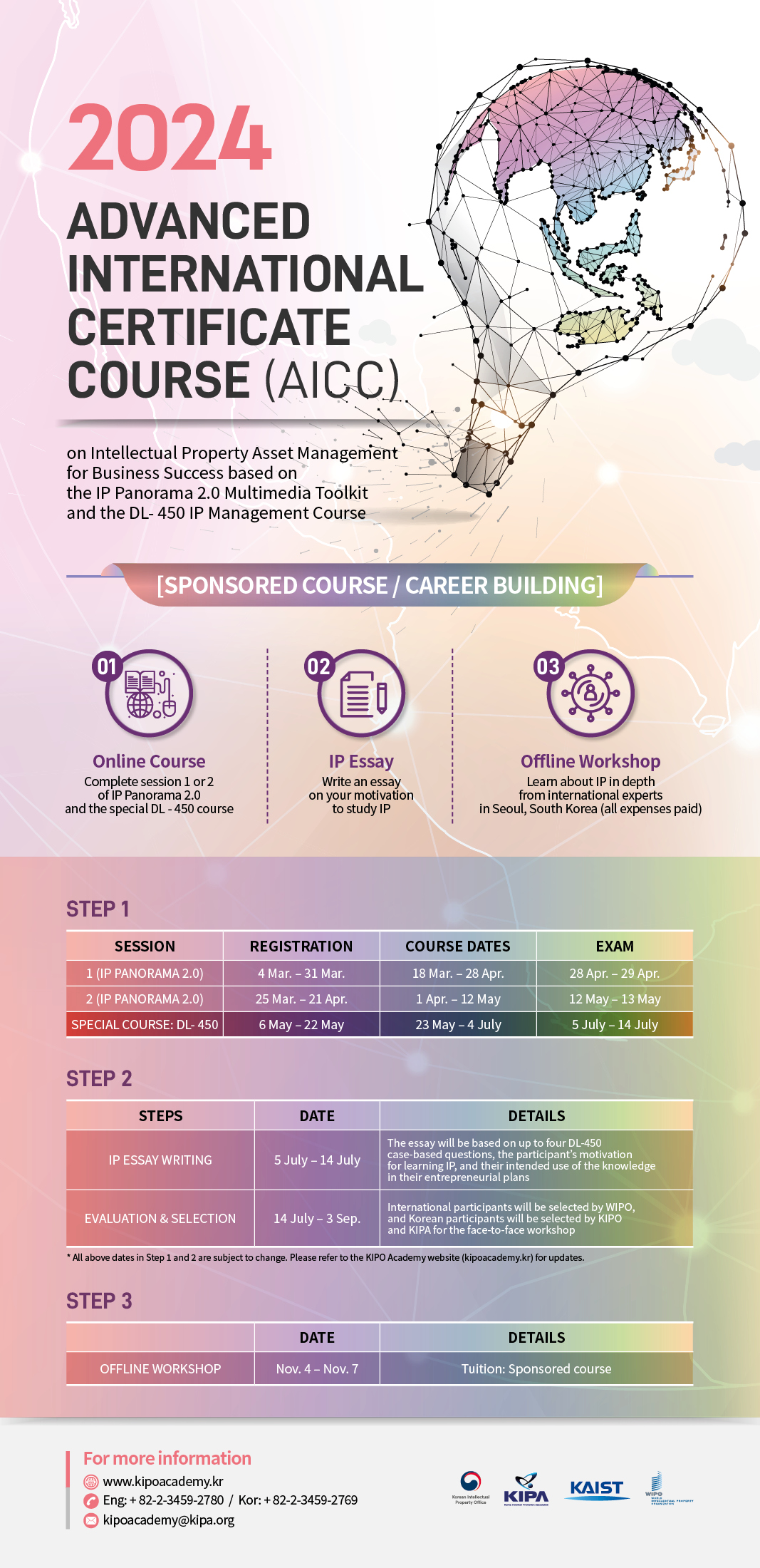 Nhằm thúc đẩy giáo dục sở hữu trí tuệ (SHTT) và phổ biến lĩnh vực sở hữu trí tuệ tới công chúng, Tổ chức SHTT thế giới (WIPO), Văn phòng SHTT Hàn Quốc (KIPO), Hiệp hội Xúc tiến Sáng chế Hàn Quốc (KIPA) và Viện Khoa học và Công nghệ Tiên tiến Hàn Quốc (KAIST) cùng phối hợp tổ chức chương trình Chương trình đào tạo Chuyên gia SHTT Hàn Quốc-WIPO năm 2024 (Korea-WIPO IP Expert Certification Course – AICC) với các thông tin như sau: