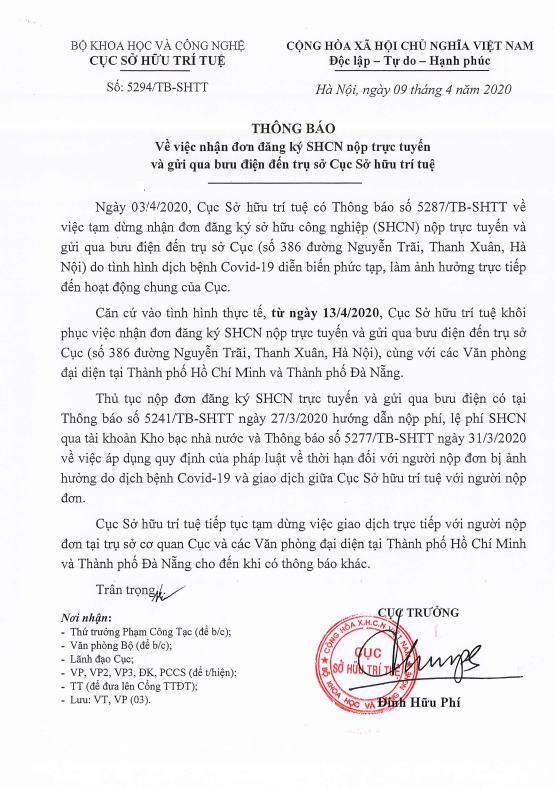 Căn cứ vào tình hình thực tế, từ ngày 13/4/2020, Cục Sở hữu trí tuệ khôi phục việc nhận đơn đăng ký SHCN nộp trực tuyến và gửi qua bưu điện đến trụ sở Cục (số 386 đường Nguyễn Trãi, Thanh Xuân, Hà Nội), cùng với các Văn phòng đại diện tại Thành phố Hồ Chí Minh và Thành phố Đà Nẵng.